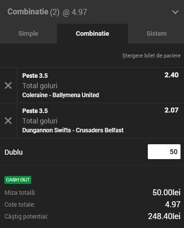 Primul bilet e compus din meciurile Coleraine – Ballymena United şi Dungannon Swifts – Crusaders Belfast. Are o cota totală de 4.97şi un câştigul posibil de 248.40 de lei. Cu 50 de ron pariaţi.