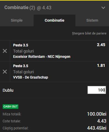 Al doilea bilet e alcătuit din ponturi pariuri pe goluri din Cupa Olandei. Excelsior Rotterdam – NEC Nijmegen şi VVSB – De Graafschap sunt cele două meciuri. Miza e de 100 de ron. Putem câştiga 443.45 de lei. La o cotă de 4.43.