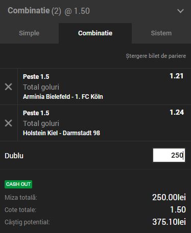 Al doilea tichet e alcătuit din ponturi pariuri pe goluri din 2.Bundesliga. Avem 2 evenimente la peste 2,5 goluri. Arminia Bielefeld – 1. FC Köln şi Holstein Kiel – Darmstadt 98 sunt partidele pe care le-am ales. Miza e de 250 de ron. Putem câştiga 375.10 de lei. La o cotă de 1.50
