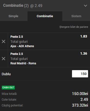 Ajax – AEK Athens şi Real Madrid – Roma sunt ponturile pariu de pe primul tichet. Are o cota totală este de 2.39 şi un câştigul posibil de 358.80 de lei. Cu 150 de ron pariaţi.