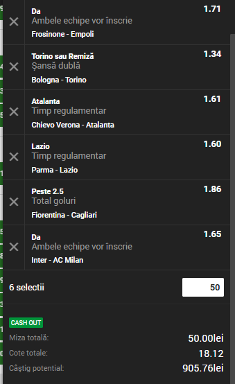 6 pronosticuri pentru fiecare meci de astăzi în Serie A e alegerea mea pentru acest material. Dacă le-am juca pe toate pe un singur bilet am avea o cotă totată de 18.12.