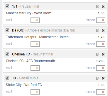 Bilet Anglia 31.01.2018. Miercuri au loc restul de sapte meciuri din etapa cu numarul 25 din Premier League, patru din aceste partide ti le-am pus pe un bilet cu sanse reale de castig: Manchester City – West Brom, Tottenham – Manchester United, Chelsea – Bournemouth si Stoke City – Watford.