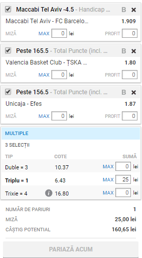 De la ora 21:05, Euroliga de baschet programează partida dintre Maccabi Tel Aviv și Barcelona. Maccabi se află pe ultimul loc care duce în play-off având 11 victorii și 10 înfrângeri. Barcelona este pe locul 13 cu 7 victorii și 14 înfrângeri. Barcelona a câștigat ultimele 4 întâlniri directe, în turul acestui sezon impunându-se cu 89-67. Maccabi are două victorii consecutive acasă, iar Barcelona are 3 înfrângeri consecutive în deplasare. Pentru Barcelona este poate ultima șansă să mai spere la play-off, în timp ce Maccabi luptă să își consolideze locul de play-off. Pontul nostru pentru acest meci este victorie Maccabi cu handicap -4,5 (inclusiv prelungiri), la o cotă de 1,91.