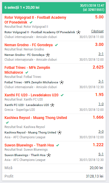 Sase meciuri i-au fost suficiente unui parior pentru a castiga un salariu decent in Romania pe luna ianuarie. A mizat 20 de lei pe bilet si a incasat un profit net de 3.100 lei.