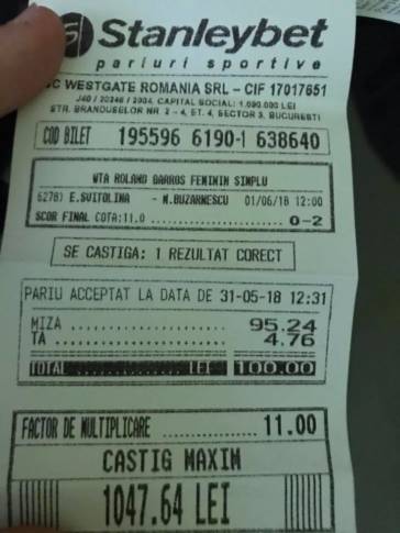 De această surpriză a profitat un parior din orașul Ploiești. Cu o zi înainte de meciul Svitolina – Buzărnescu, ploieștenul a mers la o agenție Stanleybet și a mizat 100 de lei pe o cotă 11! O astfel de cotă este foare rară în tenis. Nu o vedem prea des în ofertă, dar să fie și câștigătoare…