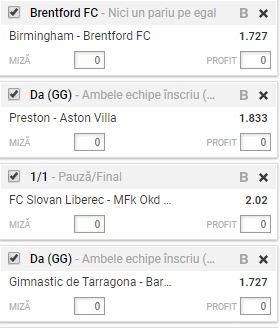 Bilet cota 10.00 01.11.2017. Ne detasam de Liga Campionilor si mizam pe patru confruntari din Cehia si din ligile inferioare ale Spaniei si Angliei: Birmingham – Brentford, Preston – Aston Villa, Slovan Liberec – Karvina si Tarragona – Barcelona B.