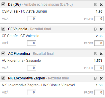 Bilet cota 10 03.12.2017. Patru meciuri ti-am ales pentru tichetul nostru de duminica: CSM Poli Iasi – Astra, Getafe – Valencia, Fiorentina – Sassuolo si Lokomotiva Zagreb – HNK Cibalia.