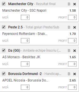 Bilet cota 10.00 17.10.2017. Ti-am ales patru meciuri pentru tichetul nostru de astazi, toate din UEFA Champions League: Manchester City – Napoli, Feyenoord – Sahtior, AS Monaco – Besiktas si APOEL – Dortmund.
