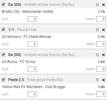 Romelu Lukaku, in meciul cu FC Basel, din Liga Campionilor. Bilet cota 10.00 20.12.2017. Cele patru meciuri de astazi ne ofera o cota totala de peste 10,00: Bristol City – Manchester United evolueaza in sferturile de finala ale Cupei Ligii Angliei, AS Monaco – Stade Rennes se joaca in campionatul Frantei, AS Roma – FC Torino este programat in ”optimile” Cupei Italiei, in timp ce Mechelen – Club Brugge se disputa in cadrul etapei cu numarul 20 din prima liga a Belgiei.