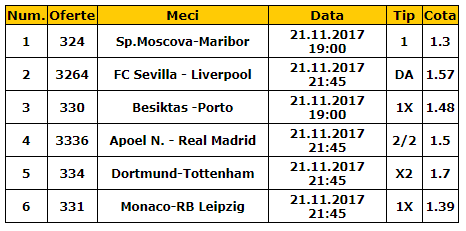 Bilet cota 10.00 21.11.2017. Tichetul de cota 10.00 de marti este format din sase meciuri: Spartak Moscova – Maribor, Sevilla – Liverpool, Besiktas – Porto, APOEL – Real Madrid, Dortmund – Tottenham si Monaco – Leipzig.