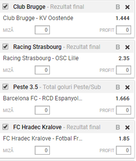 Bilet cota 10.00 25.01.2018. Tichetul nostru de joi este alcatuit din patru meciuri: Club Brugge – Oostende, Strasbourg – Lille, Barcelona – Espanyol si Hradec Kralove – Fotbal Frydek Mistek.