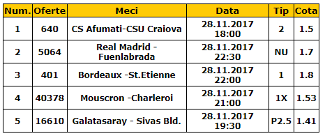 Bilet cota 10.00 28.11.2017. Ti-am pregatit un bilet format din cinci meciuri: CS Afumati – CSU Craiova, Real Madrid – Fuenlabrada, Bordeaux – Saint-Etienne, Mouscron – Charleroi si Galatasaray – Sivas Belediyespor.