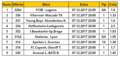 Bilet cota 100.00 07.12.2017. Ultima etapa a grupelor UEFA Europa League vine cu un bilet „colosal”, format din noua partide: FCSB – Lugano, Villarreal – Maccabi, Young Boys – Skenderbeu, Hoffenheim – Ludogorets, Basaksehir – Braga, Atalanta – Lyon, Apollon – Everton, Confenhaga – Sheriff si Arsenal – BATE Borisov.