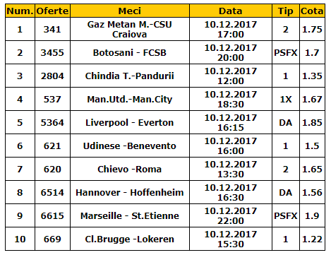 Bilet cota 100.00 10.12.2017. Ti-am pregatit o combinatie de zece meciuri, cu o cota uriasa: Gaz Metan – CSU Craiova, Botosani – FCSB, Chindia – Pandurii, Man. United – Man. City, Liverpool – Everton, Udinese – Benevento, Chievo – Roma, Hannover – Hoffenheim, Marseille – St. Etienne si Brugge – Lokeren.