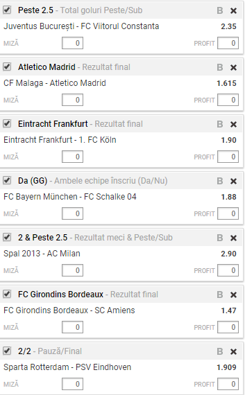 Bilet cota 100.00 10.02.2018. Sambata iti oferim sapte meciuri care insumeaza o cota totala de 110,36: Juventus Bucuresti – Viitorul Constanta, Malaga – Atletico Madrid, Frankfurt – FC Koln, Bayern Munchen – Schalke 04, Spal – AC Milan, Bordeaux – Amiens si Sparta Rotterdam PSV Eindhoven.