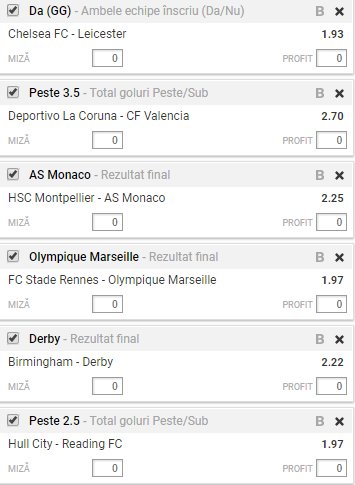 Bilet cota 100.00 13.01.2018. In weekend, atunci cand avem o oferta mult mai bogata, e musai sa avem si un bilet ceva mai mare, cu o cota care sa ne genereze un profit consistent cu o investitie mica. Pentru ziua de sambata iti propunem sase meciuri, cu cote cuprinse intre 1,97 si 2,70: Chelsea – Leicester, Deportivo – Valencia, Montpellier – AS Monaco, Rennes – Marseille, Birmingham – Derby si Hull City – Reading.