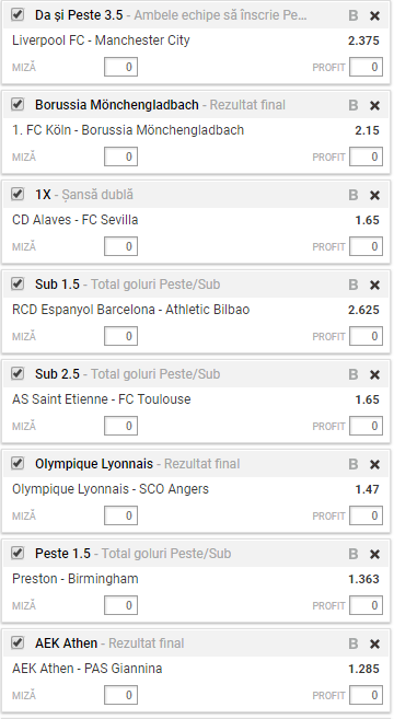 Bilet cota 100.00 14.01.2018. Opt meciuri alcatuiesc tichetul nostru de duminica: Liverpool – Manchester City, FC Koln – Gladbach, Alaves – FC Sevilla, Espanyol – Athletic Bilbao, Saint Etienne – FC Toulouse, Lyon – Angers, Preston – Birmingham si AEK Atena – PAS Giannina.
