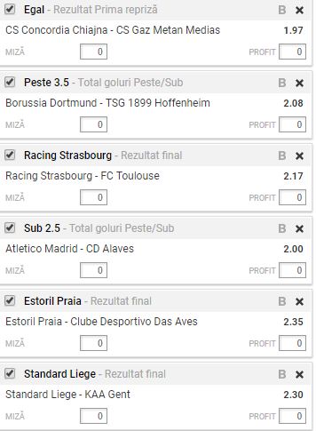Bilet cota 100.00 16.12.2017. Pentru ca ne plac si astfel de bilete, ceva mai indraznete, iti recomandam pentru ziua de sambata un tichet care genereaza o cota totala de aproape 100.00. Ca sa punem mana pe acest factor de multiplicare trebuie sa ne ”iasa” sase meciuri: Concordia Chiajna – Gaz Metan, Dortmund – Hoffenheim, Strasbourg – Toulouse, Atletico Madrid – Alaves, Estoril – Aves si Standard Standard – Gent.
