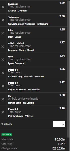 Bilet cota 100 pentru sâmbătă, 3 noiembrie mai cuprinde următoarele meciuri: Wolverhampton – Tottenham, Inter – Genoa, Leganés – Atlético Madrid, Lyon – Bordeaux, VfL Wolfsburg – Borussia Dortmund, Bayer Leverkusen – Hoffenheim, Hertha Berlin – RB Leipzig şi PSV Eindhoven – Vitesse