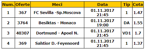 Bilet cota 5.00 01.11.2017. Biletul de cota 5.00 de miercuri este compus din patru partide din Liga Campionilor: Sevilla – Spartak Moscova, Besiktas – Monaco, Dortmund – APOEL, Sahtior – Feyenoord.
