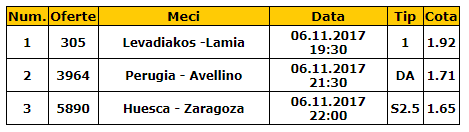 Bilet cota 5.00 06.11.2017. Va propunem trei meciuri extrem de atractive pentru biletul de cota 5.00 de luni: Levadiakos – Lamia, Perugia – Avellino si Huesca – Zaragoza.