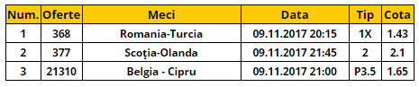 Bilet cota 5.00 09.11.2017. V-am pregatit trei pronosticuri pentru biletul de cota 5.00 de joi: Romania – Turcia, Scotia – Olanda si Belgia U21 – Cipru U21