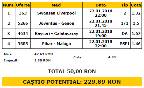 Bilet cota 5.00 22.01.2018. Pentru tichetul de luni v-am selectat patru meciuri din patru campionate ale Europei. Este vorba despre Swansea – Liverpool, Juventus – Genoa, Kayserispor – Galatasaray si Eibar – Malaga.
