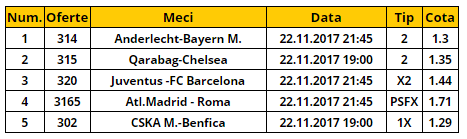 Bilet cota 5.00 22.11.2017 Pentru tichetul de miercuri iti propunem cinci meciuri: Anderlecht – Bayern, Qarabag – Chelsea, Juventus – Barcelona, Atletico Madrid – AS Roma si CSKA Moscova – Benfica.