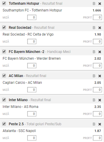 Bilet cota 50.00 21.01.2018. Ti-am realizat un tichet destul de curajos, care ne-ar putea aduce o suma consistenta de bani cu o investitie minima. Ti-am ales sase meciuri: Southampton – Tottenham, Real Sociedad – Celta Vigo, Bayern – Werder Bremen, Cagliari – AC Milan, Inter – Roma si Atalanta – Napoli.
