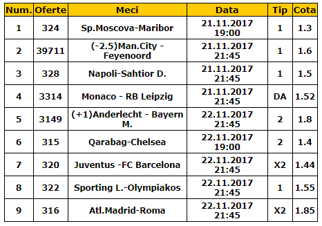 Bilet cota 50.00 Liga Campionilor. Ti-am pregatit un bilet colosal, format din noua meciuri: Spartak Moscova – Maribor, Manchester City – Feyenoord, Napoli – Sahtior, Monaco – Leipzig, Anderlecht – Bayern Munchen, Qarabag – Chelsea, Juventus – Barcelona, Sporting – Olympiakos si Atletico Madrid – Roma.