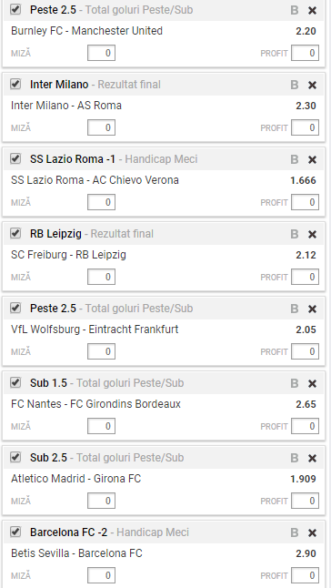Bilet cota 500.00 pentru weekend. In caz ca doresti un profit rapid cu bani putini, acest tichet este cea mai buna varianta pentru tine in acest weekend. Biletul are o cota de peste 500 si este format din opt meciuri: Burnley – Manchester United, Inter – AS Roma, Lazio – Chievo, Freiburg – RB Leipzig, Wolfsburg – Frankfurt, FC Nantes – Bordeaux, Atletico madrid – Girona si Betis Sevilla – FC Barcelona.