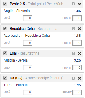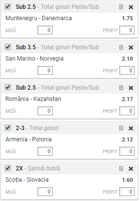 Slovacia e principala favorita la locul al doilea in grupa F. Mai intai, insa, trebuie sa treacă cu bine de deplasarea din Scotia, o nationala care are cu un punct mai putin in clasament. Continuam biletul cu un alt meci din grupa F si mizam pe spectacol in partida dintre Anglia si Slovenia. Urmeaza pe bilet o victorie a Cehiei, in Azerbaidjan, intr-un meci fără nicio miza. Apoi, vine singurul „X” de pe bilet: Austria – Serbia. Si, intr-un final, inchidem cu clasicul „GG” pentru meciul dintre Turcia si Islanda.