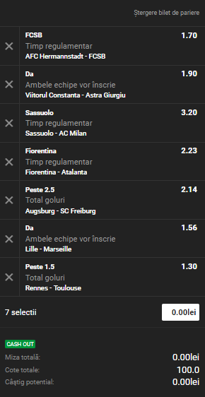 Aşadar, predicţiile pariu pentru cele două meciuri de de Liga 1 le ştiţi deja: AFC Hermannstadt – FCSB, câştigă oaspeţii; Viitorul Constanta – Astra Giurgiu, ambele echipe marchează. Celelalte partide alese pentru biletul de cotă 100 sunt Sassuolo – AC Milan şi Fiorentina – Atalanta (Serie A), Augsburg – SC Freiburg (Bundesliga), Lille – Marseille şi Rennes – Toulouse (Ligue 1).
