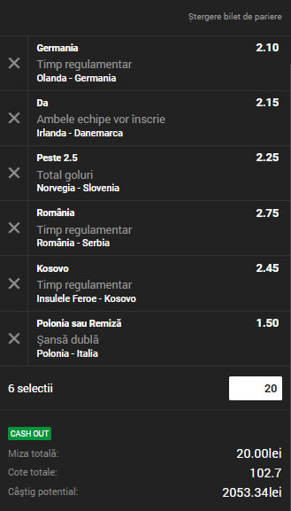 Aşa cum vă spuneam mai sus, am 6 ponturi îndrăzneţe pentru zilele sâmbătă şi duminică din Liga Naţiunilor, toate combinate pe un singur bilet. Am ales pentru el patru tipuri de pariu, învingătoare, 1X, pariu pe goluri şi GG. Ele sunt echipele în care am mare încredere că se vor impune: Germania, România şi Kosovo. Polonia sunt convins că nu va pierde acasă. Atenţie! Cotele pentru aceste pronosticuri sunt destul de măricele.