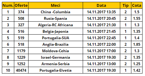 Bilet favorite 14.11.2017. Zece meciuri compun biletul favoritelor de marti: China – Columbia, Rusia – Spania, Algeria – RC Africana, Belgia – Japonia, Portugalia – SUA, Anglia – Brazilia, Moldova – Cehia, Israel – Germania, Armenia – Serbia si Portugalia U21 – Elvetia U21.