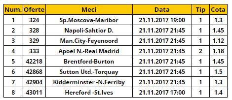 Bilet favorite 21.11.2017 Iti propunem opt pronosticuri pentru tichetul de favorite de marti: Spartak Moscova – Maribor, Napoli – Sahtior, Manchester City – Feyenoord, APOEL – Real Madrid, Brentford – Burton, Sutton – Torquai, Kidderminster – Ferriby si Herefort – St. Ives.