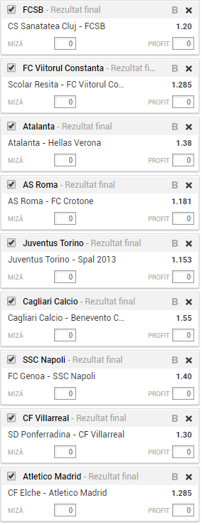 Biletul favoritelor este compus in mare parte din meciuri din Serie A, care programeaza etapa intermediara la mijlocul acestei saptamani. Ziua se deschide la Bergamo, unde Atalanta primeste vizita celor de la Hellas Verona, o echipa cu o singura victorie in actuala stagiune. Urmeaza Cagliari – Benevento, un meci cu o favorita mai mult decat clara. Chiar daca nu a avut nici ea un start foarte bun de sezon, Cagliari nu are voie sa piarda in fata ultimei clasate. Benevento nu a castigat niciun punct in primele noua runde. La varful clasamentului, Napoli are o deplasare relativ usoara la Genoa, o alta echipa care a bifat un singur succes in actualul sezon. Juventus o primeste acasa pe SPAL, o alta nou-promovata in actualul sezon, care nu a reusit decat o victorie in Serie A. Propunerile din Italia se incheie cu AS Roma – Crotone, in care capitolinii nu isi mai permit pasi gresiti daca vor sa nu piarda contactul cu locurile de Liga Campionilor.
