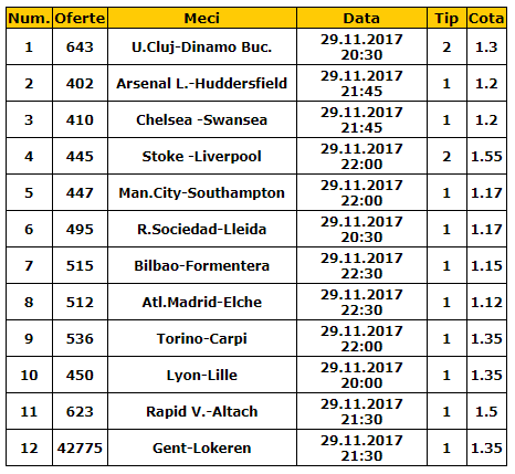 Bilet favorite 29.11.2017. Tichetul dedicat favoritelor este compus din 12 meciuri, dupa cum urmeaza: U Cluj – Dinamo, Arsenal – Huddersfield, Chelsea – Swansea, Stoke – Liverpool, Manchester City – Southampton, Real Sociedad – Lleida, Bilbao – Formentera, Atletico Madrid – Elche, Torino – Carpi, Lyon – Lille, Rapid Viena – Altach si Gent – Lokeren.