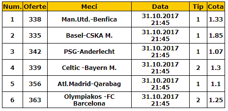 Bilet favorite 31.10.2017. Sase meciuri din UEFA Champions League completeaza biletul de marti dedicat favoritelor: Manchester United – Benfica, Basel – CSKA, PSG – Anderlecht, Celtic – Bayern, Atletico Madrid – Qarabag si Olympiakos – Barcelona.