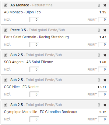 Bilet Franta etapa 26. Cinci meciuri formează biletul nostru exclusiv cu meciuri din Hexagon: AS Monaco – Dijon, PSG – Strasbourg, Angers – Saint Etienne, Nice – Nantes si Marseille – Bordeaux. Toate aceste partide ne aduc o cota de 10,58.