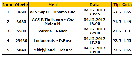 Bilet goluri 04.12.2017. Pentru ziua de luni ti-am pregatit un bilet de goluri format din cinci meciuri, dupa cum urmeaza: Sepsi – Dinamo, ACS Poli – Gaz Metan, Verona – Genoa, Ludogoret – Dunav Ruse si Midtylland – Odense.