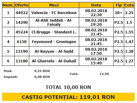 Bilet goluri 08.02.2018. Biletul de goluri de joi este format din sase meciuri, care formeaza o cota de 12.50. Discutam despre Valencia – FC Barcelona, Al-Ahli – Al Faisaly, Club Brugge – Standard, Feyenoord – Groningen, Al Rayyan – Al Sadd si Al Gharafa – Al Duhail.