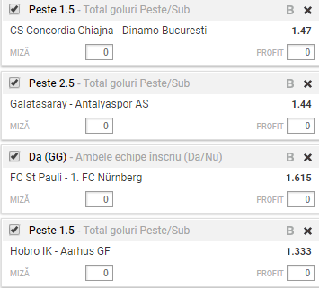 Bilet Goluri 12.02.2018. Luni nu avem foarte multe meciuri în ofertă, dar ți-am compus un bilet cu șanse mari de reușită, unul care este format doar din pariuri pe goluri. Asadar, luăm în considerare patru partide: Concordia Chiajna – Dinamo, Galatasaray – Antalyaspor, St. Pauli – Nurnberg si Hobro – Aarhus.