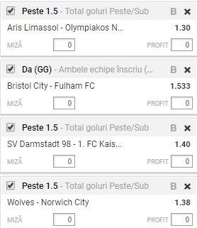 Bilet Goluri 21.02.2018. Avem un singur meci din primele eșaloane ale Europei: Aris Limassol – Olympiakos Nicosia și alte trei meciuri din diviziile secunde al Germaniei și Angliei: Darmstadt – Kaiserslautern și Wolverhampton – Norwich.