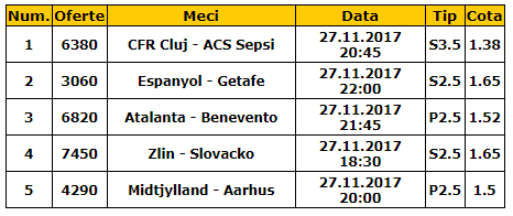 Bilet goluri 27.11.2017 Ti-am pregatit un bilet cu cinci meciuri pentru luni: CFR Cluj – Sepsi OSK, Espanyol – Getafe, Atalanta – Benevento, Zlin – Slovacko, Midtjylland – Aarhus.