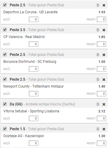 Bilet goluri 27.01.2018. Cand avem multe meciuri la dispozitie, ne este foarte greu sa nu-ti alcatuim un bilet al golurilor. Este un fel de ghid care iti recomanda cele mai bune pariuri de ”over” sau de ”GG”. Pentru sambata aceasta ti-am ales sase meciuri: Deportivo – Levante, Valencia – Real Madrid, Dortmund – Freiburg, Newport – Tottenham, Vitoria Setubal – Sporting Lisabona si Goztepe – Kayserispor.