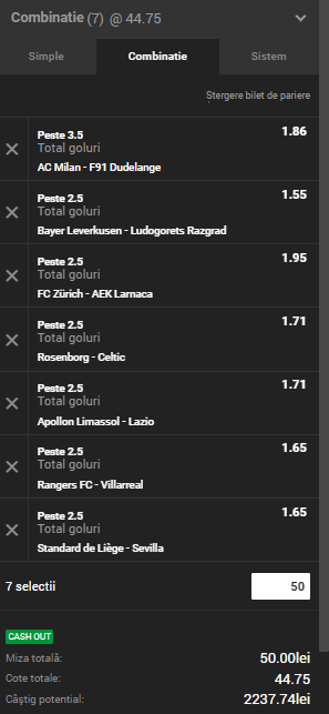 Bilet goluri din Europa League 29.11.2018. 7 evenimente din cele 24 mi se par extrem de potrivite pentru a fi jucate la goluri. Le-am combinat pe toate pe un singur tichet. Cota este de 44,75!