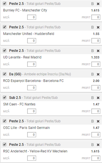 Bilet goluri sambata + duminica. Pentru weekend-ul ce sta sa inceapa, avem o multime de posibilitati de a realiza un profit decent. Una dintre ele ar fi sa mizam pe goluri. Asadar, ti-am alcatuit un tichet format din sapte meciuri: Burnley – Manchester City, Manchester United – Huddersfield, Levante – Real Madrid, Espanyol – Barcelona, Caen – Nantes, Lille – PSG si Anderlecht – Mechelen. Toate aceste evenimente produc o cota de 23,31.