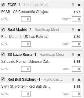 Bilet Handicap 05.11.2017. Pentru ziua de duminica ti-am ales patru meciuri care au sanse ridicate sa se termine la o diferenta mare de goluri: FCSB – Concordia, Real Madrid – Las Palmas, Lazio – Udinese si St. Polten – RB Salzburg.