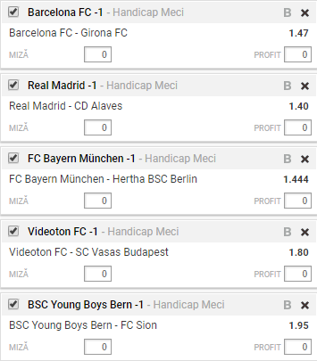 Bilet handicap 24.02.2018. Sunt câteva meciuri astăzi în Europa care ar trebui să fie extrem de dezechilibrate. Cele mai clare din ele sunt Barcelona – Girona, Real Madrid – Alaves, Bayern – Hertha, Videoton – Vasas Budapest și Young Boys – FC Sion. Toate aceste partide ne pun la dispoziție o cotă de 10,43.